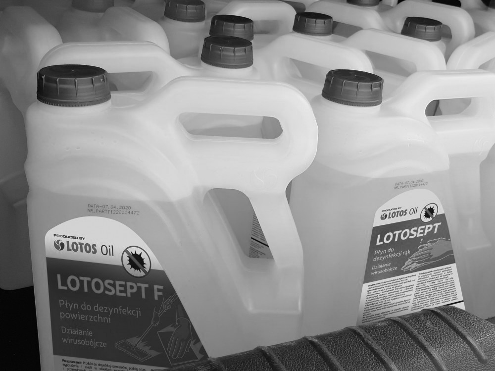 Na południe trafi 5200 litrów płynu LOTOSEPT do dezynfekcji rąk oraz 4800 litrów płynu LOTOSEPT F do dezynfekcji powierzchni, podłóg, ścian i mebli. Produkcję tego pierwszego spółka LOTOS Oil rozpoczęła w połowie kwietnia 2020 r., w czasie gdy niedobór na rynku tego rodzaju produktów utrudniał funkcjonowanie wielu przedsiębiorcom. Obecne moce produkcyjne pozwoliły już na rozszerzenie dystrybucji płynów, przez co są one również dostępne na stacjach paliw LOTOSU. Płyn LOTOSEPT F do dezynfekcji powierzchni, podłóg, ścian i mebli wprowadzono na rynek miesiąc później. Zarówno jeden, jak drugi produkt zarejestrowane zostały w Urzędzie Rejestracji i Produktów Leczniczych, Wyrobów Medycznych i Produktów Biobójczych, co świadczy o ich wysokiej jakości i spełnieniu wymagań najwyższej ochrony zdrowia. Substancją czynną w płynach jest etanol 70g/100g.